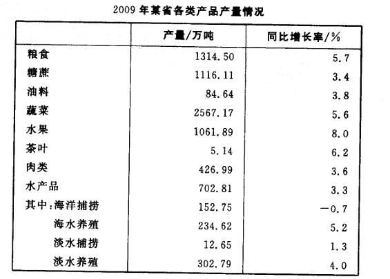 2009年,某省全年粮食作物播种面积253. 85万公顷,比上年增长1. 5%;糖蔗种植面积13. 58万公顷,下降0. 2%;油料种植面积33.14万公顷,增长2. 3%;蔬菜种植面积113. 84万公顷,增长2. 3%。下列作物2009年比2008年增产量最多的是( )。