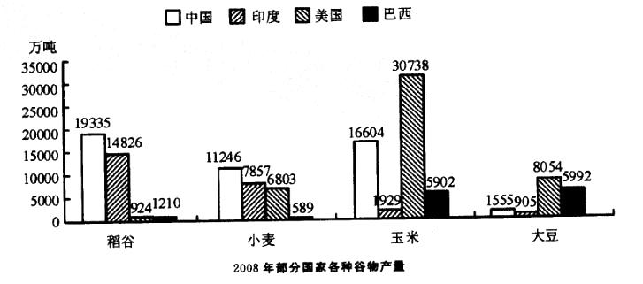 下列四种谷物中,2008年与2000年相比全世界增产量最多的是( )。