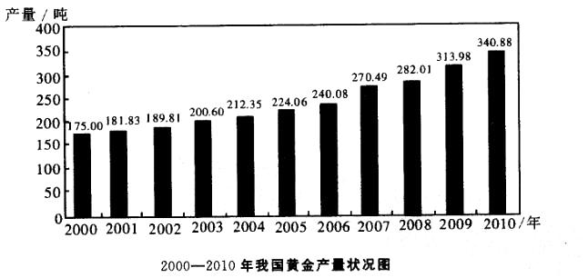 2010年,我国黄金产量为340. 88吨,同比增长8. 57%。其中矿产金280. 04吨,同比增长7. 27%;有色副产金60. 84吨,同比增长14. 95%。