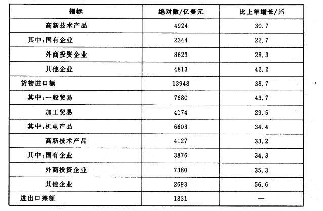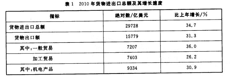 2010年,我国全年货物进出口总额29728亿美元,比上年增长34.7%。其中,货物出口15779亿美元,增长31. 3%;货物进口13948亿美元,增长38.7%。进出口差额1831亿美元,比上年减少126亿美元。![]()