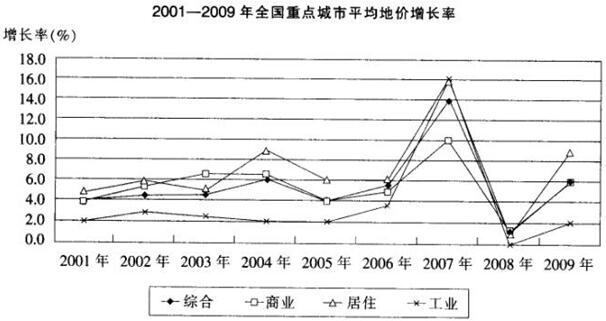 2001-2009年,全国重点城市平均地价增长率最高的年份是:( )