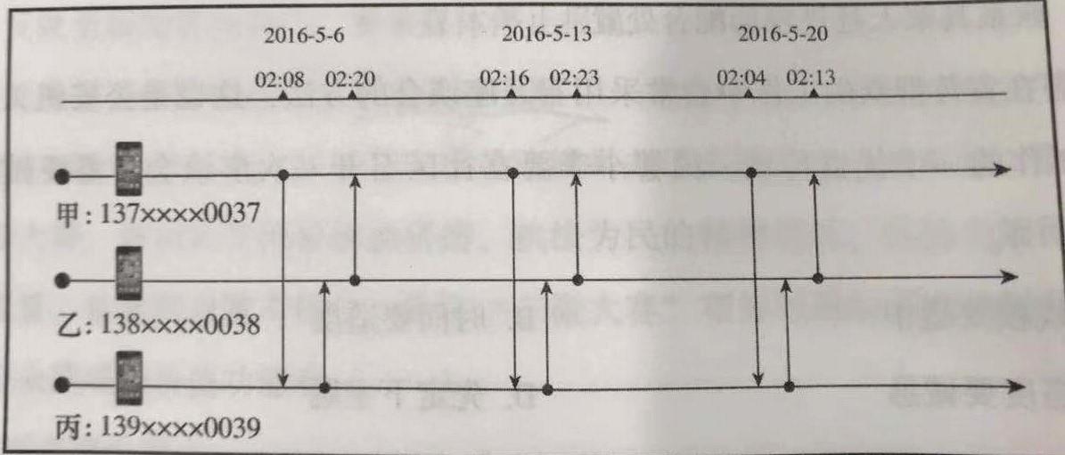 从时间上把握犯罪嫌疑人的活动规律是犯罪信息分析的常用方法。下图是三名盗窃嫌疑人通话记录的时序关系,恰当的判断有( )。