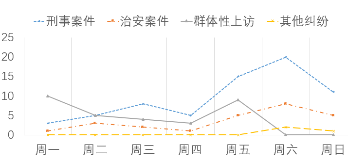根据一定时间内的警情统计,可以预测违法犯罪的发展趋势,在合理时间节点做出恰当应对,有效提升警务效能。下图是某公安分局的警情周统计图。当地警方重点应对群体性突发事件的时间节点是( )。