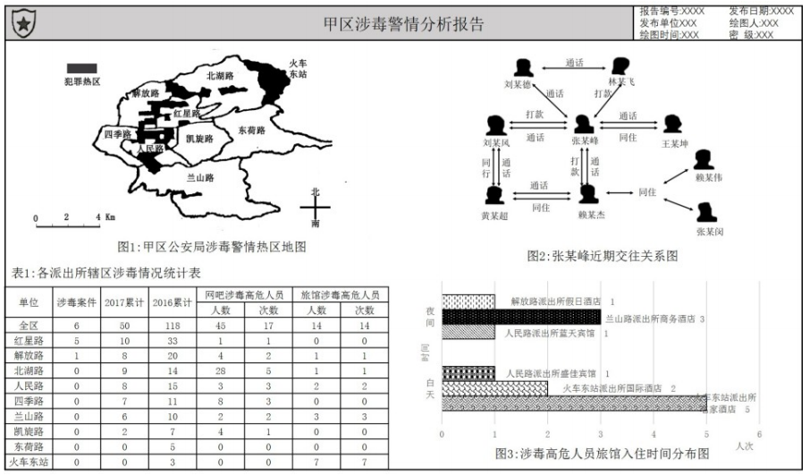 甲区位于某市东南部,辖区面积210.22平方公里,共辖8个街道,户籍人口39.5万,登记外来人口42.5万。甲区公安分局情报中心对一周警情(2017年7月14日14时至7月21日14时)进行了统计分析。本周共接有效警情1591起,环比上升0.76%。其中,涉毒案件6起,环比上升200%,网吧、旅馆、KTV等场所行业中涉毒高危人员活动比较频繁,在一定区域内形成热区(如图1所示)。为精准防控涉毒犯罪,情报民警分析了各派出所涉毒案件的分布情况,以及网吧、旅馆涉毒人员活动情况(如表1所示)。对比较活跃的涉毒人员交往关系进行了分析(如图2所示),梳理了旅馆中涉毒高危人员入住时间分布情况(如图3所示)。