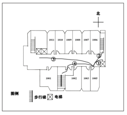 张某到一处风景区旅游,入住某宾馆10楼1005客房,乘西侧电梯上楼。晚上18时欲从东侧步行梯下楼锻炼,发现楼道正在施工,进入步行梯的门已经上锁,遂乘坐东侧电梯下楼,从南侧步行梯上楼。晚22时许,该宾馆突然失火,张某的正确逃生路线是: