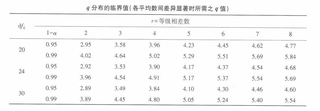 为确定某种心理疗法对焦虑障碍的长程效应,一位研究者选取了一个n= 10的样本,治疗前以标准化工具测试了其焦虑水平。在治疗结束时、治疗结束后1个月、治疗结束后6个月分别以同样工具测试了其焦虑水平。研究者用ANOVA来分析数据,得到处理内平方和为500,误差均方为10,F比率为5。根据上述信息回答下列问题:(1)依据以上信息作出该研究的方差分析表。(2)假定治疗前、治疗结束时、治疗结束后1个月和治疗结束后6个月被试的平均焦虑水平分别为:22.5、17.3、19.6和19.9,请应用N-K检验法对治疗前后不同条件间的焦虑水平进行多重比较(相应的q值表附后)。
