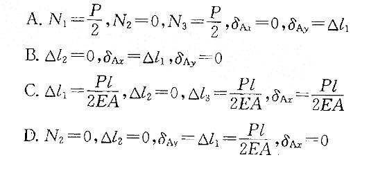 结构受力如图所示。若用N1,、N2、N3和匕分别代表杆①、②、③的轴力和伸长,用表示点A的水平位移和竖直位移,则下列结论中正确的是: