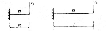 已知图示二梁的抗弯截面刚度EI相同,若二者自由端的挠度相等,则P1/P2为: A.2