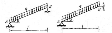 两根简支斜梁如图所示,承受竖向均布载荷,但右端可动铰支座B的支承方式不同,则这两梁的内力图有下述哪种关系?