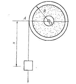 半径R=10cm的鼓轮,由挂在其上的重物带动而绕O轴转动,如图所示。重物的运动方程为x= 100t2(x以m计,t以s计)。则鼓轮的角加速度α的大小和方向是: