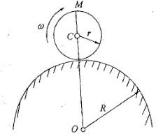 一半径为r的圆盘以匀角速ω在半径为R的圆形曲面上作纯滚动(如图所示), 则圆盘边缘上图示M点加速度aM的大小为: