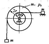 两重物的质量均为m,分别系在两软绳上。此两绳又分别绕在半径各为r与2r并固结在一起的两轮上。两圆轮构成之鼓轮的质量亦为m,对轴O的回转半径为ρO。两重物中一铅垂悬挂,一置于光滑平面上。当系统在左重物重力作用下运动时,鼓轮的角加速度α为: