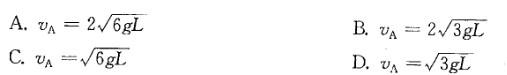 均质杆OA长L,可在铅直平面内绕水平固定轴O转动。开始杆处在如图所示的稳定平衡位置。今欲使此杆转过1/4转而转到水平位置,应给予杆的另一端A点的速度vA的大小为:![]()
