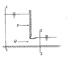 如图所示,设水在闸门下流过的流量Q=4. 24m3/s,门前断面1的总水压力为P1=19. 6kN,门后断面2的总水压力为P2 =3.13kN,闸门前、后的断面平均流速分别为v1= 2.12m/s,v2= 5. 29m/s,不计水头损失和摩擦阻力,则作用于单位宽度(1m)上闸门的推力F为: