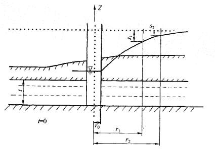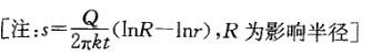 已知承压含水层的厚度t=7.5m,用完全井进行抽水试验,在半径r1=6m、 r2=24m处,测得相应的水头降落s1=0.76m,s2=0. 44m,井的出流量Q=0. 01m3/s,则承压含水层的渗流系数k为:![]()