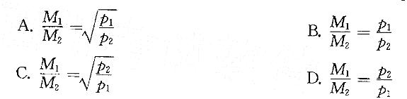 有两种理想气体,第一种的压强记作p1,体积记作V1,温度记作T1,总质量记作m1,摩尔质量记作M1;第二种的压强记作p2,体积记作V2,温度记作T2,总质量记作m2,摩尔质量记作M2;当V1=V2,T1=T2,m1=m2时,则M1/M1为:![]()
