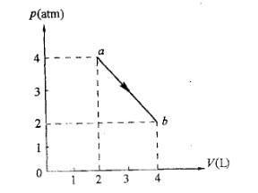 如图所示,一定量的理想气体,沿着图中直线从状态a(压强p1=4atm,体积V1=2L)变到状态b(压强p2=2atm,体积V1=4L),则在此过程中气体做功情况,下列哪个叙述正确?