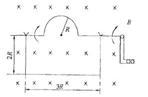 用一根硬导线弯成半径为R的半圆形,将其置于磁感应强度为B的均匀磁场中,以频率f旋转,如图所示,这个导体回路中产生的感应电动势ε等于:![]()