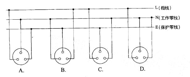中性点接地的三相五线制电路中,所有单相电气设备电源插座的正确接线是图中的哪个图示接线?![]()