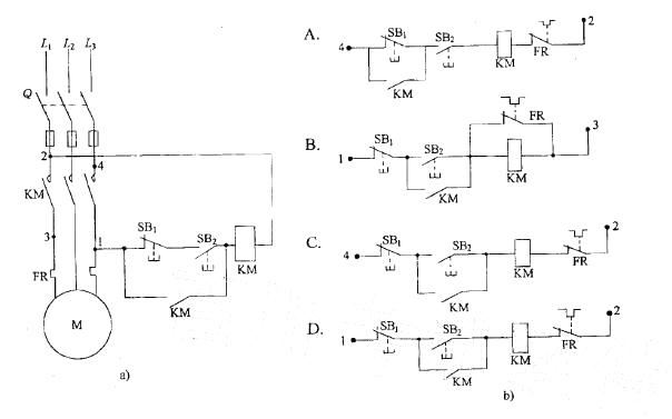 如图a)所示控制电路的错误接线不能使电动机M起动。要使M起动并能连续运转,且具备过载保护、失压保护、短路保护的功能,正确的接线是图b)中哪个图所示?![]()