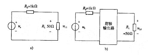 将放大倍数为1,输入电阻为100Ω,输出电阻为50Ω的射极输出器插接在信号源(us,RS)与负载(RL)之间,形成图b)电路,与图a)电路相比,负载电压的有效值:
