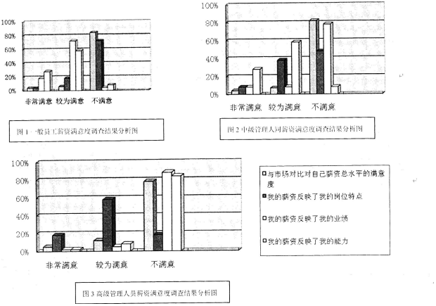 高,财务实力明显增强。但由于领导层重视生产轻视管理.使公司各项管理的基础工作十分薄弱?规章制度也不够健全完善,特别是在人力资源管理方面,绝大部分员工对公司目前的薪资制度怨声载道,严重地影响了公司生产经营活动的正常运行。为此,公司董事会决定对员工薪资制度进行一次全面调整c该公司目前一般员工实行的是技术等级工资制,采用计时工资加奖金(按月支付)的计酬形式,而管理人员实行的是职务等级工资制,按照职务高低支付工资,每个季度按照对各个部门的绩效考评结果,支付一定数额的季度奖,其奖金水平不得超过一般员工奖金水平30%,图1、图2和图3是一家管理咨询公司对该公司员工薪资满意度调查结果的分析图。