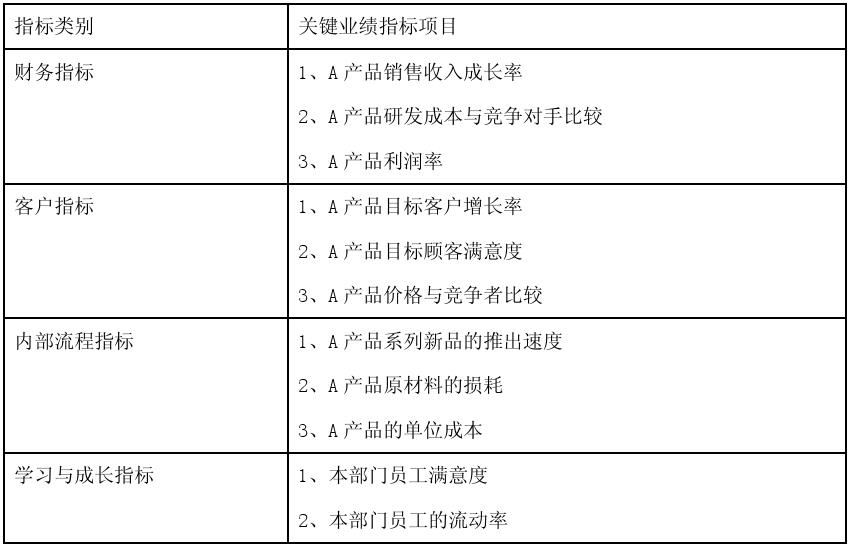 Y公司为其新开发的A产品专门成立了A产品事业部,负责A产品的研发和销售工作。A产品是一种全新概念的产品,市场发展前景良好,市场上暂时没有类似的产品能与其相比。公司对该部门的要求是:尽一切可能占领市场,加大对研发的投入,保持技术的领先性,树立品牌的形象,最近两年对利润率的要求不高。Y公司为该部门设计了今年部门的平衡计分卡,设计的结果如表1: 表1:A产品事业部平衡计分卡的指标表