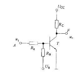 晶体管非门电路如图所示,已知UOC= 15V,UB = -9V,RC= 3kΩ,RB = 20kΩ,β= 40,当输入电压U1=5V时,要使晶体管饱和导通,RX值不得大于多少?(设UBE=0. 7V,集电极和发射极之间的饱和电压UCES=0.3V)