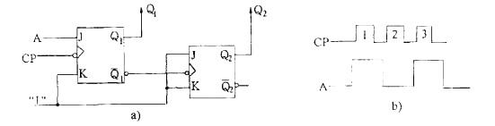 由两个主从型JK触发器组成的逻辑电路如图a)所示,设Q1、Q2的初始态是0、0, 已知输入信号A和脉冲信号CP的波形,如图b)所示,当第二个CP脉冲作用后,Q1、Q2将变为: