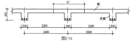 某钢筋混凝土现浇肋形楼盖的次梁,如图所示,次梁高度h=450mm,宽度b=200mm,次梁的计算跨度l0=6m,间距为2.4m,净距sn=2.2m,楼板厚度hf′=80mm,纵向受力钢筋合力点至混凝土边缘的距离as=35mm。混凝土强度等级为C30,纵向受拉钢筋采用热轧HRB335钢筋。翼缘的计算宽度bf′最接近( )mm。
