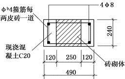 有一截面为240mm×490mm的组合砖柱(见图),柱高为3.4m,柱两端为不动铰支座,组合砌体采用C20混凝土,MU10砖,M7.5混合砂浆,混凝土内配钢筋。该柱的受压承载力设计值最接近于( )kN。