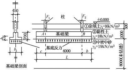 某双柱下条形基础梁,由柱传至基础梁顶面的竖向力设计值分别为F1和F2。基础梁尺寸及工程地质剖面如图所示。假定基础梁为无限刚度,地基反力按直线分布。