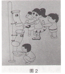 操场上新安装了一个投篮架(如图1),幼儿经常在这里玩投篮游戏。一天,几个幼儿带着笔刷和小水桶来到了这里(如图2)。他们先快乐地粉刷投篮架,之后开始往篮筐里灌水,有的从上面灌,有的在下面接,再灌、再接……相互配合,反反复复,忙得不亦乐乎。![]()