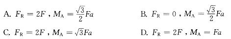 等边三角形ABC,边长为a,沿其边缘作用大小均为F的力F1、F2、F3,方向如图所示,力系向A点简化的主矢及主矩的大小分别为:![]()