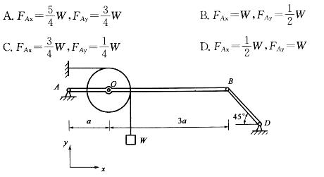 水平梁AB由铰A与杆BD支撑。在梁上O处用小轴安装滑轮。轮上跨过软绳。绳一端水平地系于墙上,另端悬持重W的物块。构件均不计重。铰A的约束力大小为:![]()