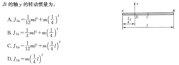 图示匀质杆AB长l,质量为m。点D距点A为1/4l。杆对通过点D且垂直于A![]()