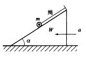 三角形物块沿水平地面运动的加速度为a,方向如图。物块倾斜角为α。重W的小球在斜面上用细绳拉住,绳另端固定在斜面上。设物块运动中绳不松软,则小球对斜面的压力FN的大小为: