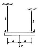 图示刚梁AB由标1和杆2支承。已知两杆的材料相同,长度不等,横截面面积分别为A1和A2,若荷载P使刚梁平行下移,则其横截面面积: