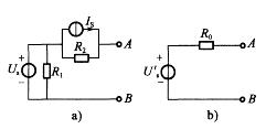 如图a)所示电路按戴维南定理等效成图b)所示电压源时,计算R0的正确算式为: