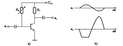 晶体管单管放大电路如图a)所示时,其中电阻RB可调,当输入Ui、输出U0的波形如图b)所示,输出波形: