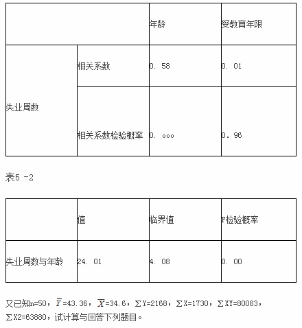 对某地区失业人员进行调查,得到有关失业周数、失业者年龄和受教育年限等资料,对此资料进行相关与回归分析后所得的结果如表5 -1、表5-2所示。