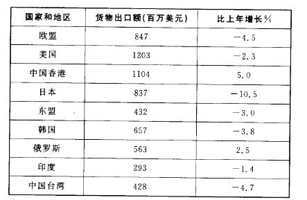 下表为2009年我国某地区对主要国家(地区)货物出口额及其增长速度。根据下表,以下说法正确的是?( )