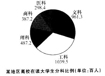 根据下列饼图,该地区高校在读大学生文科学生比工科学生少( )。