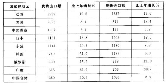 根据材料,除印度外,我国对主要国家和地区货物进出口总额增长率最高的国家(地区)的进口额为多少亿美元?( ) A. 2929