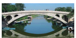 教师展示赵州桥的图片。出示 PPT1,要求学生先不看课文,说清楚图上的大拱与四个小拱的位置关系。
