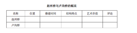 学生活动,精读有关赵州桥和卢沟桥的段落,找出能说明这两座桥具有中国石拱桥所有特点的句子,并填入设计好的表格中。