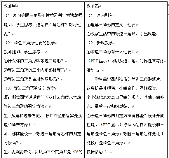案例: 下面是两位教师关于《等边三角形》的教学过程。请从下列三个方面对甲乙两位教师的教学过程进行评价: (1)引入的特点;(6分) (2)教师教的方式;(7分) (3)学生学的方式。(7分)