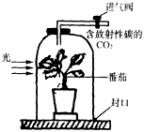 把一盆栽番茄植株放在钟罩内(如下图),再把含放射性碳的二氧化碳依图中所示输入罩内,1h后把进气阀关闭。然后把番茄植株移出,洗去土壤,用仪器记下根系的放射性碳的剂量。再把这些根烘干,切成小块,放到养着饥饿金鱼的不带放射性物质的金鱼缸内,4天后,把金鱼从缸中取出,经检测发现鱼组织内放射性碳超过正常水平。请回答:
