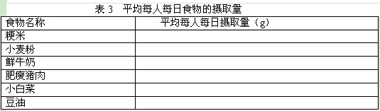 平均每人每日各种食物的摄入量是多少?(计算结果保留整数,填写于表3中)