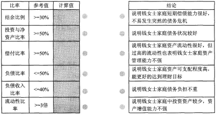 钱女士现年30岁,是一位单亲母亲,有一个5岁大的儿子。目前,钱女士在一家地产公司任销售经理,月薪12000元(税前),年终奖金10万元(税前),无任何社保。母子二人住在2013年1月初购买的一套两居室的住房中,房款100万中首付20%,剩余部分采取每月等额本息贷款方式,贷款年利率6%,贷款期限20年,目前房屋市价105万元。 钱女士拥有活期存款10万元。2013年年末存入定期存款30万元,2014年初听朋友介绍购买某股票型基金10万元,目前基金净值12万元。2013年钱女士离婚后考虑到自己一旦发生意外,儿子的生活将发生困难,因此她购买了年缴保费1800元的定期寿险,保险条款规定在保障期限内钱女士因意外或疾病而去世,可以获得60万元的保险赔付,保单现金价值12万元。钱女士家庭支出中,儿子的教育费用占有很大比例,钱女士离婚后将所有希望全部寄托在儿子身上,除了给儿子提供最好的学习教育外,还让儿子上书法、绘画等特长班,每月各项学费支出就达3000元。此外母子二人的生活费每月2000元,钱女士每年会带儿子到国内著名景点旅游,平均每年花费10000元。钱女士每年美容休闲支出8000元。 目前,钱女士想请理财师通过理财规划为其解决以下问题: ①钱女士感觉自己的保险仍然不够完备,但由于对保险不太了解,希望理财规划师能为其设计完善的保险保障规划。 ②钱女士一直希望给儿子最好的教育,计划儿子在国内读完大学后继续到国外深造,综合考虑国内外求学费用,预计在儿子13年后上大学时共需准备高等教育金110万元,投资报酬率为5%。 ③钱女士计划在25年后退休,考虑到其独身一人,因此预计需要养老费用200万元,投资报酬率为7%。 提示:信息收集时间为2014年12月31日,不考虑活期存款利息收入,定期存款年利率3%,月支出均化为年支出的十二分之一,工资薪金所得的起征点为3500元,计算过程保留两位小数,计算结果保留到整数位。 填写客户财务比率表,并勾选财务比率分析结论,将定期存款视为非流动性资产。 表10—5财务比率分析表